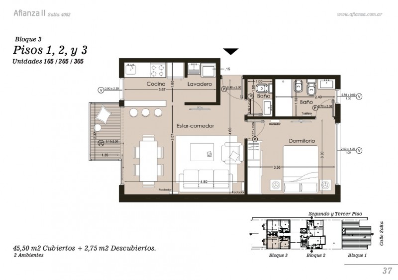 De 48,25 m² totales (45,50 m² cubiertos + 2,75 m² de balcón). Antigüedad 3 años.